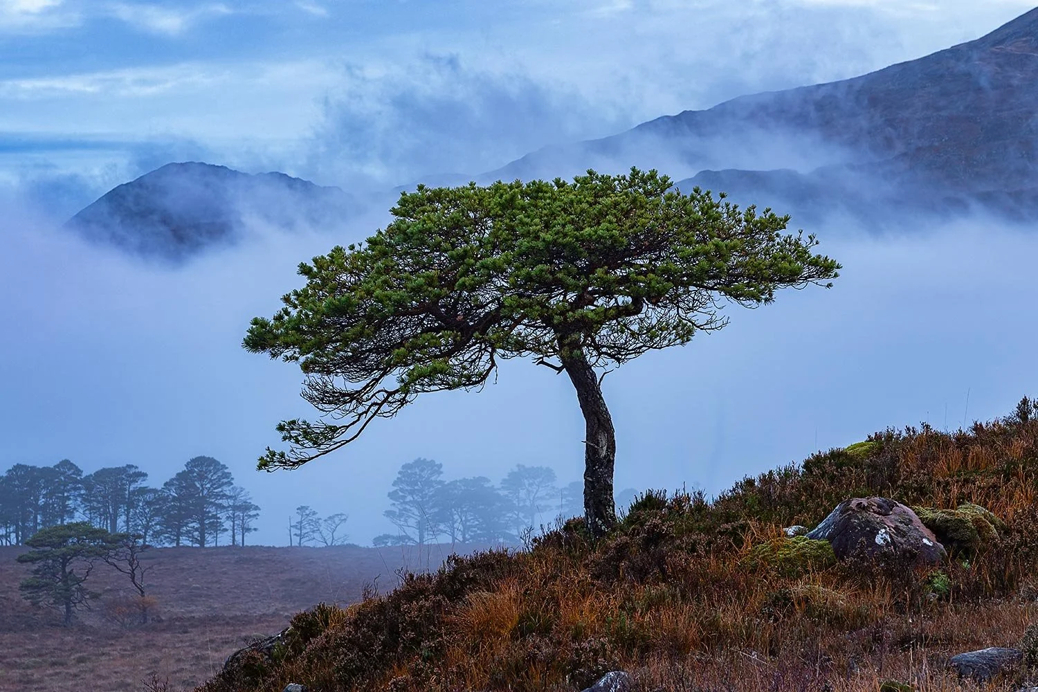My first few days in the far reaches of North West Scotland, around the beautiful Loch Maree area, were definitely themed by the weather.. mainly rain and this photo of a lone scots pine was taken during a rainy spell as the rain showers made their way over the famous Slioch Loch Maree mountain peak in the Beinn Eighe Nature Reserve.